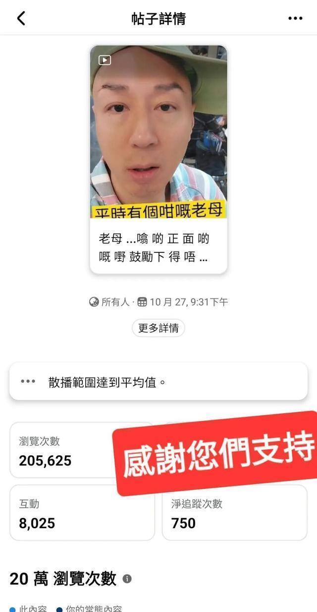 对于一线红星这数字可能微不足道,但对于戴耀明来说却是人生的“高光时刻”。他兴奋得连发几条帖文庆祝,更将数据截图留念。面对突如其来的“爆红获赞”,戴耀明感谢网民,同时亦不改其幽默自嘲的本色。他坦言拍片是因为“最近很空闲”,并写道:“小弟玩这么多年Facebook……都未试过有5千多个点赞二十九万多浏览量”