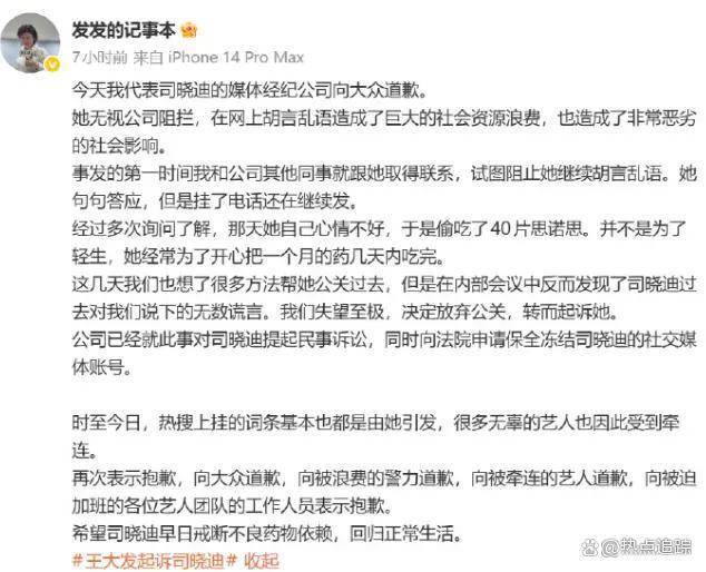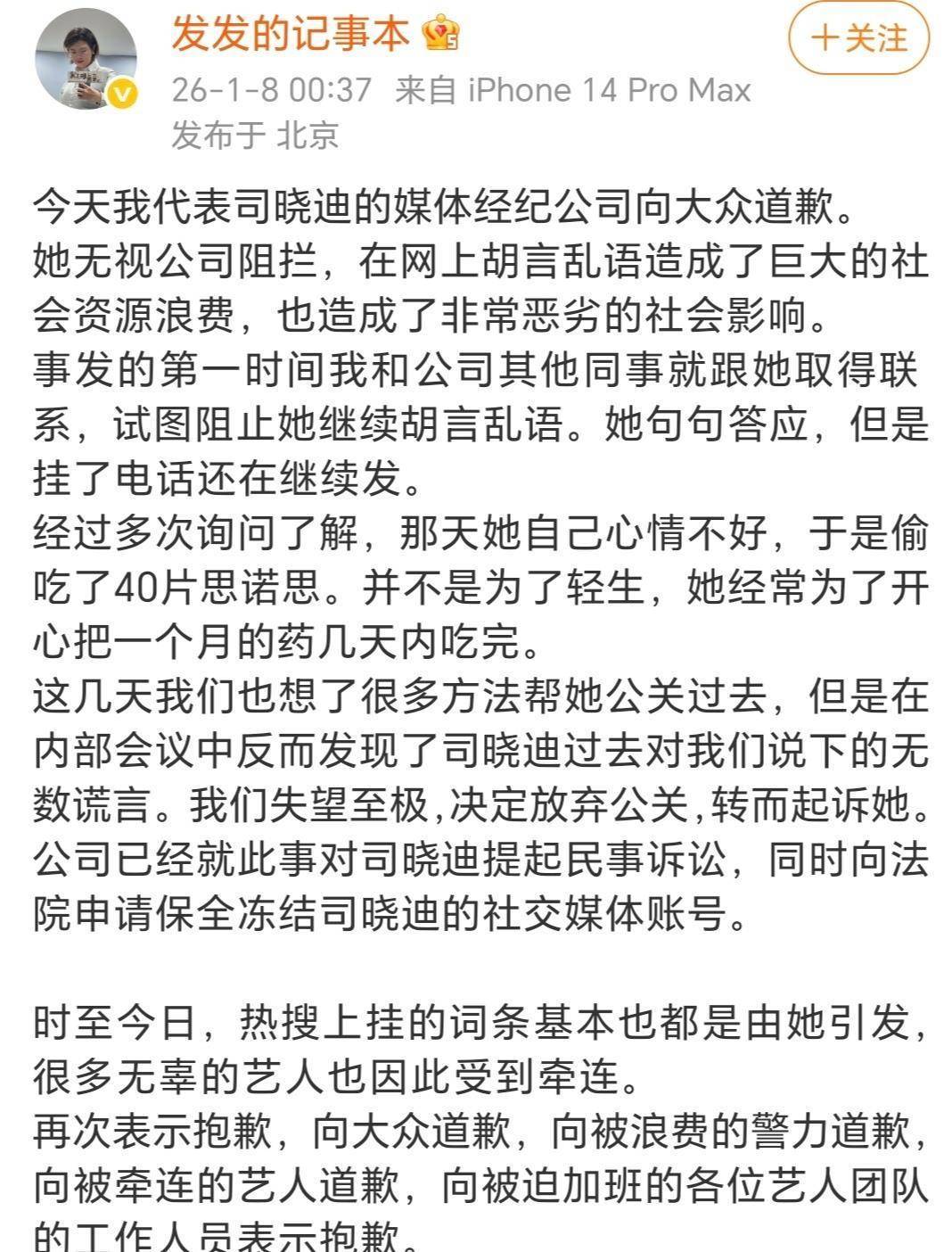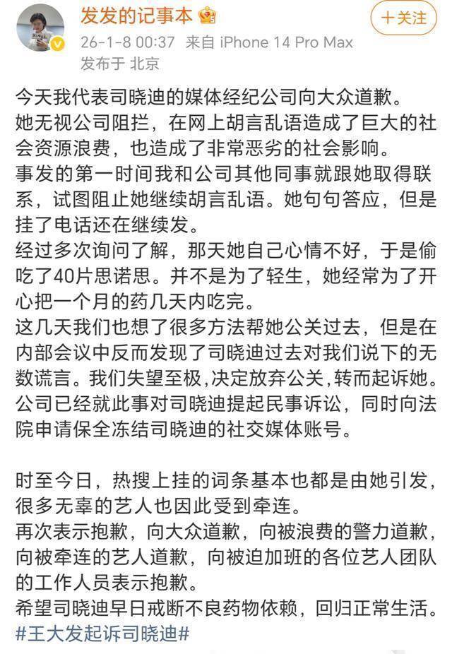 王大发的声明堪称“教科书级切割”。她先是撇清公司关系,强调司晓迪的爆料纯属“个人行为”,甚至声称自己“多次阻止无效”;接着又抛出猛料,说司晓迪不仅撒谎成性,还经常以“家人住院”“抑郁症发作”为由借钱,实际却用来买助眠药,甚至一次吞下40片思诺思闹自杀。更离谱的是,王大发透露,司晓迪在爆料闹大后,居然还想拉着公司一起直播带货,简直把流量当成了生意。这番操作下来,司晓迪瞬间从“正义爆料者”变成了“贪慕虚荣的撒谎精”。