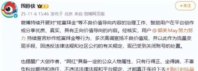 再次出狱后,她依旧走着炫富的老路,而且这次愈加放肆。 不仅公开表示, 坐牢是财富,会让人变得强大 。 在面对网友友善提醒别再犯罪时,她居然还说管观众什么事! 最终,国家在2025年11月再度出手,以持续 宣扬炫富拜金价值观与售卖违法商品为由,全面封禁郭美美。