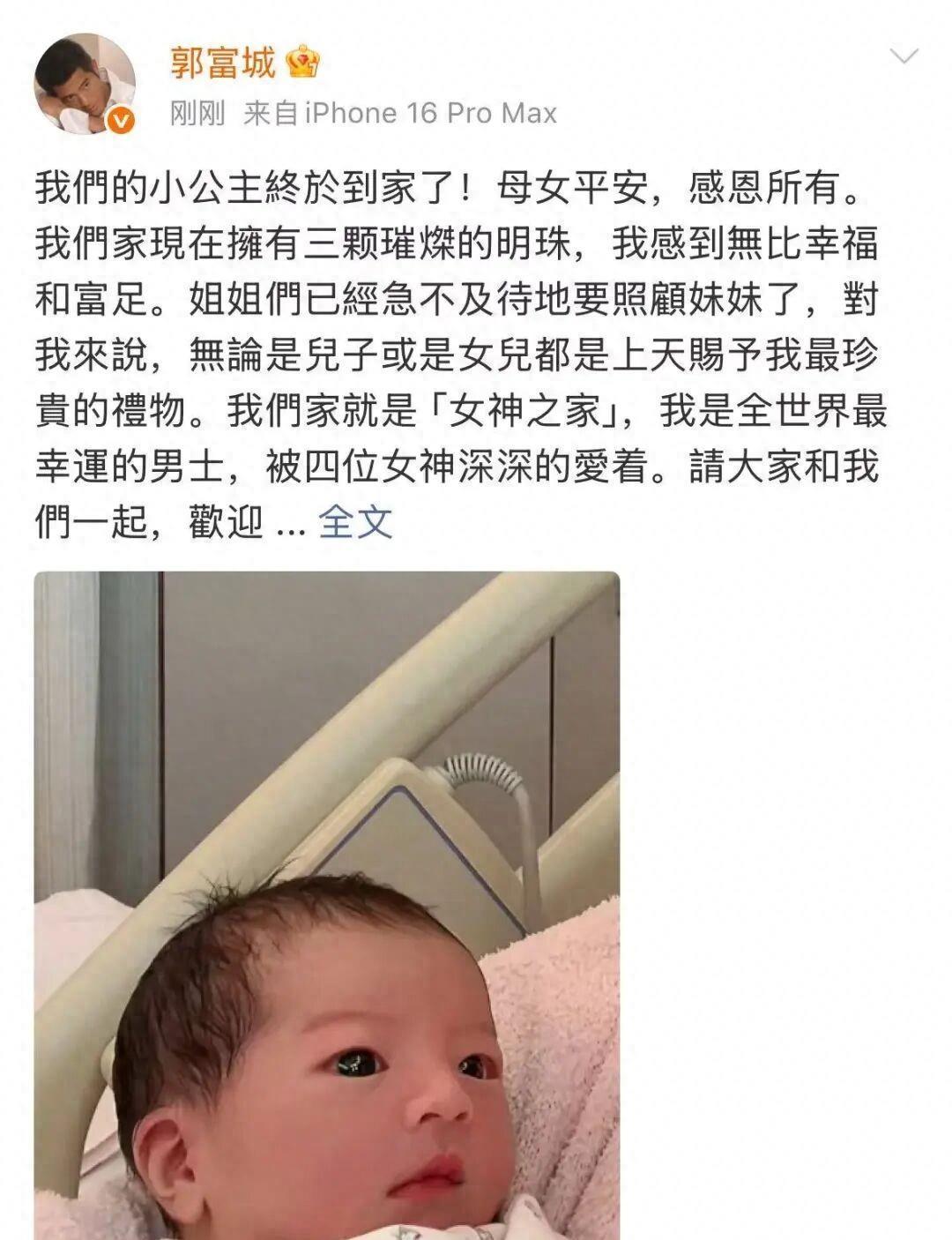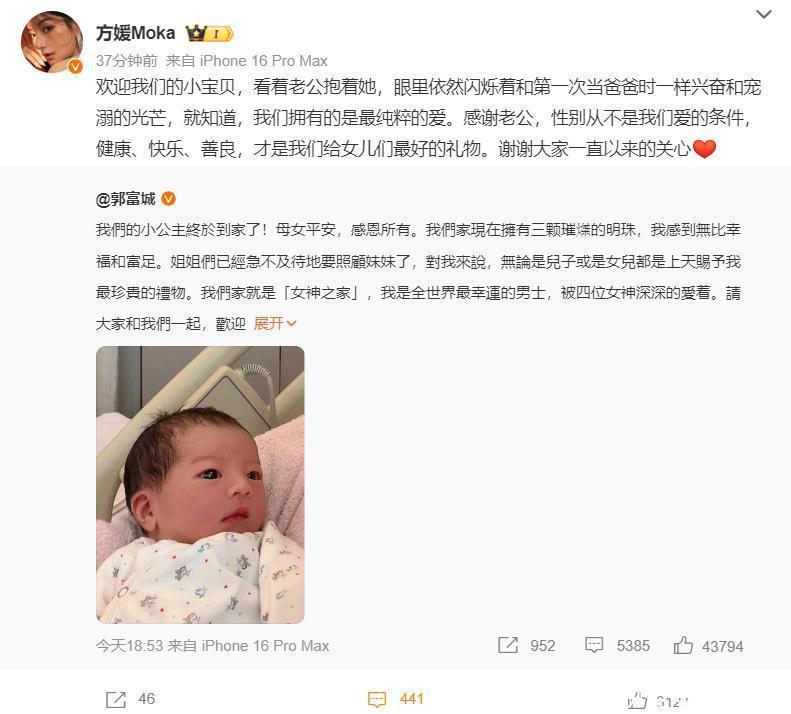方媛也说看到郭富城抱着三宝,眼里依然闪烁着和第一次当爸爸时一样兴奋和宠溺的光芒,她就知道,“我们拥有的是最纯粹的爱”。随后她写道“性别从不是我们爱的条件,健康、快乐、善良,才是我们给女儿们最好的礼物,谢谢大家一直以来的关心。”