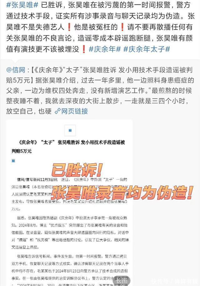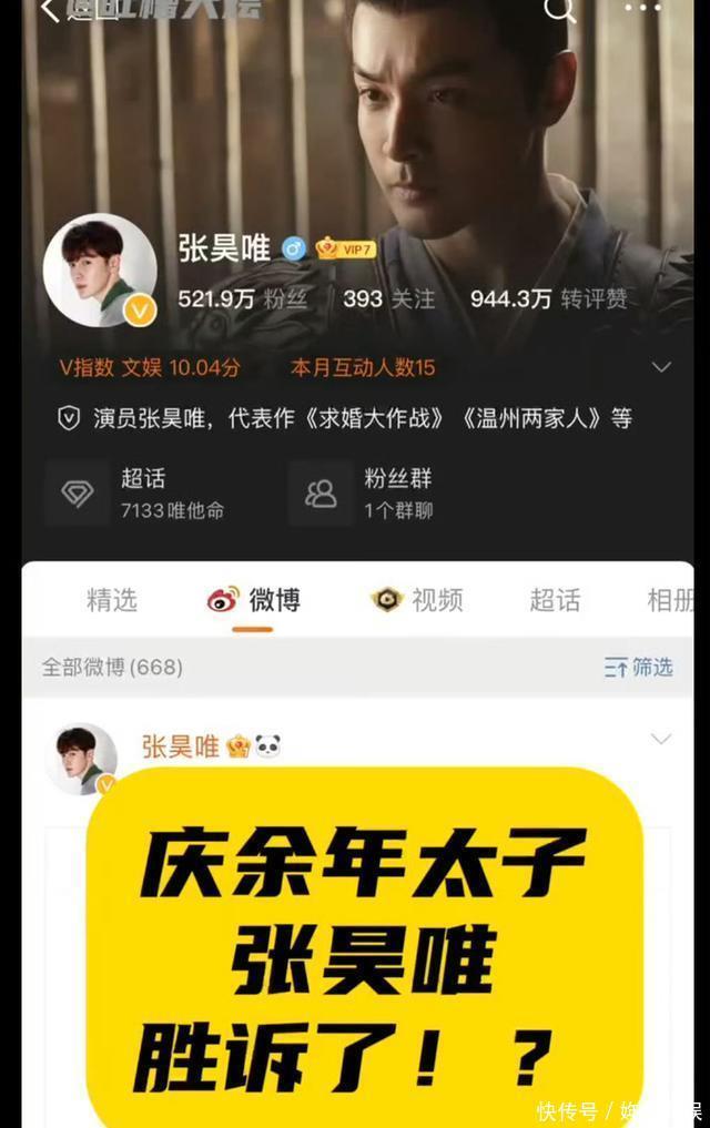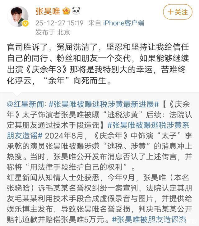 官司胜诉了,冤屈洗清了,坚忍和坚持让我给信任自己的同行、粉丝和朋友一个交代,如果能够继续出演《庆余年3》那将是我特别大的幸运,苦难终化浮云,“余年”向死而生。 ——张昊唯