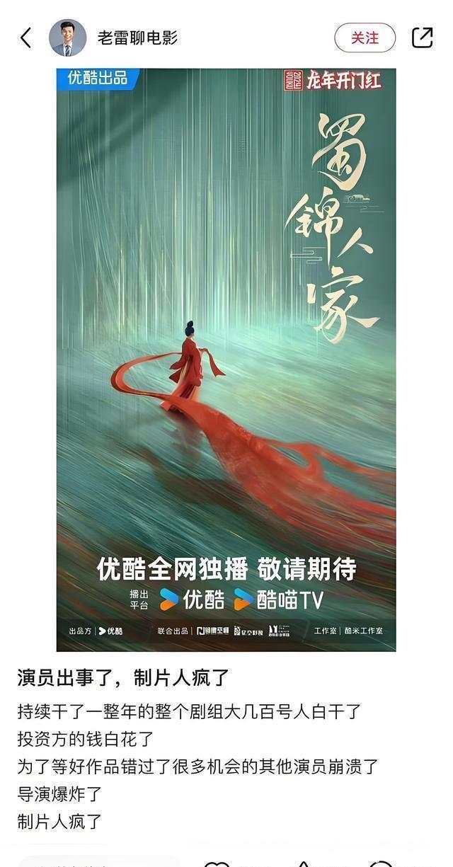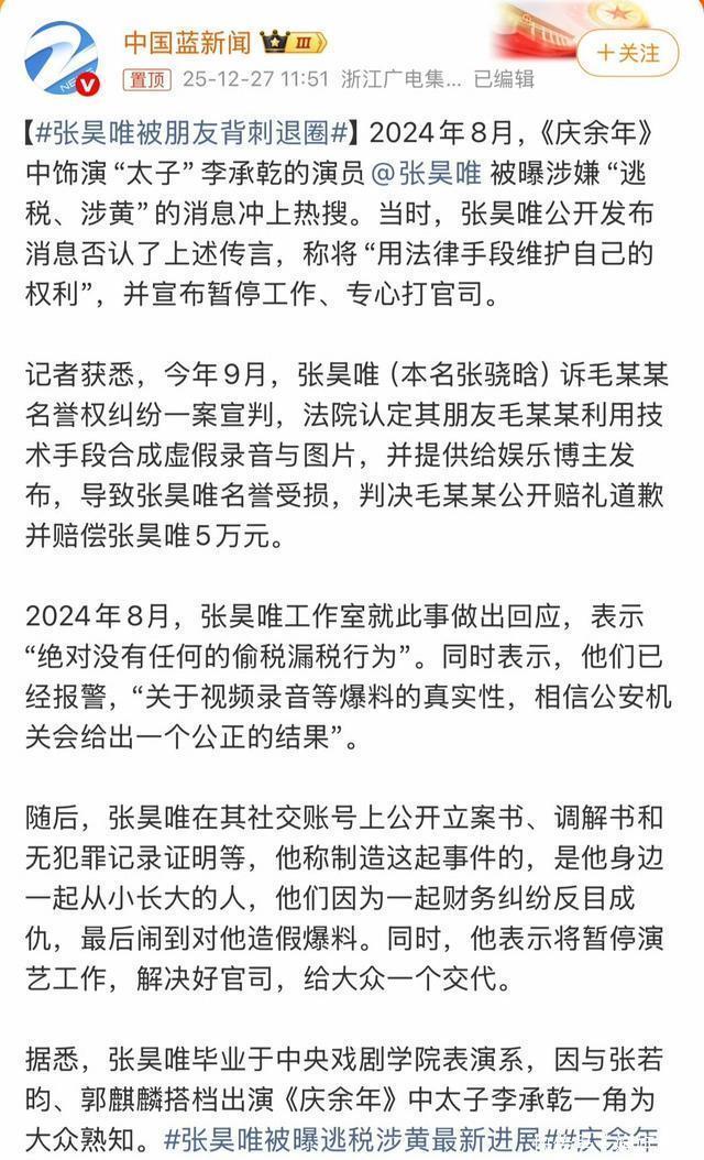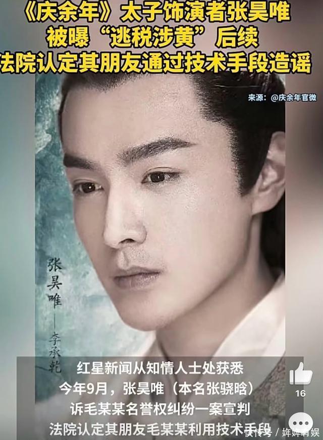 02 张昊唯因为这件事演艺事业全面中断。 谣言爆发后,张昊唯主演的《蜀锦人家》延期播出且其戏份被AI换脸,《庆余年3》开机推迟,商务合作全部终止。