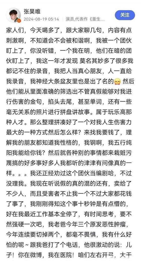 维权期间,张昊唯暂停所有演艺工作,同时需照料身患癌症的父亲,自述经历"人生至暗时刻"。