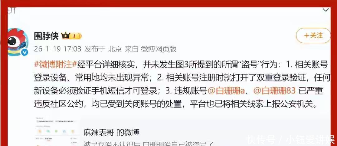 到这儿还没完,后续的反转更打脸。微博官方很快核实,白珊珊说的“账号被盗”根本是瞎编,登录设备和常用地都没异常,还把线索上报了公安机关。